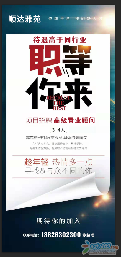 正文摘要:熟手,無責任底薪3500元/月,完成任務追加至5000元/月。提成2000-9000元/套不等。順達雅苑現(xiàn)房銷售,無需守盤,貨源充足,發(fā)傭快。年齡不限 |